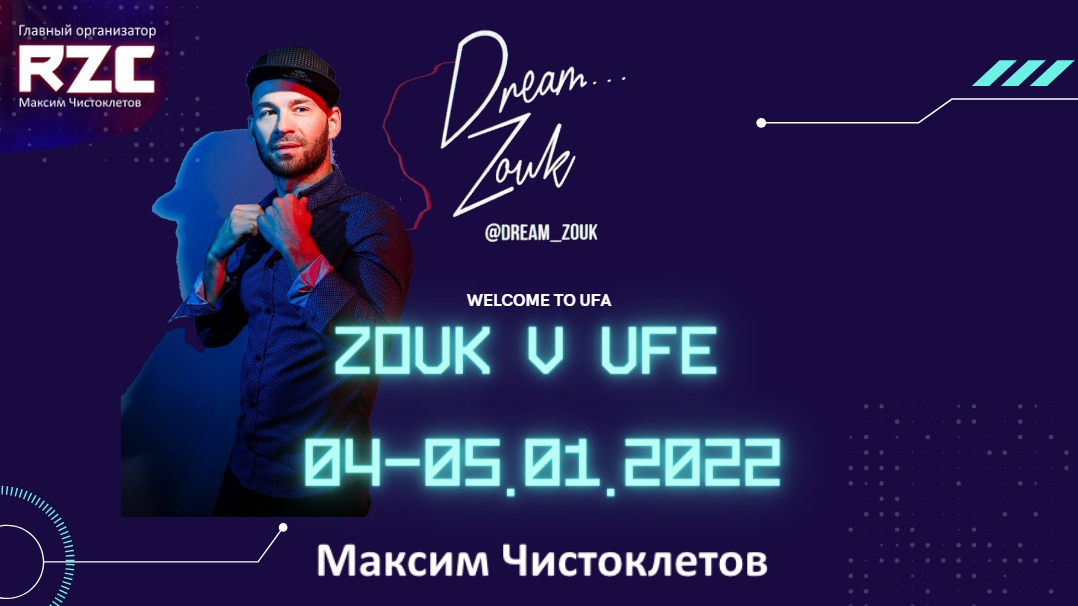 Dream… Zouk - 4-5 января 2022 - Уфа - 2 дня ивента - мега крутой тренер Максим Чистоклетов, г. Санкт-Петербург - 9 часов мастер- классов - бомбическая вечеринка - диджей из Казани - просторное помещение и пол с танцевальным покрытием - домашняя атмосфера - все в зоне шаговой доступности - кайфовая аура и уют